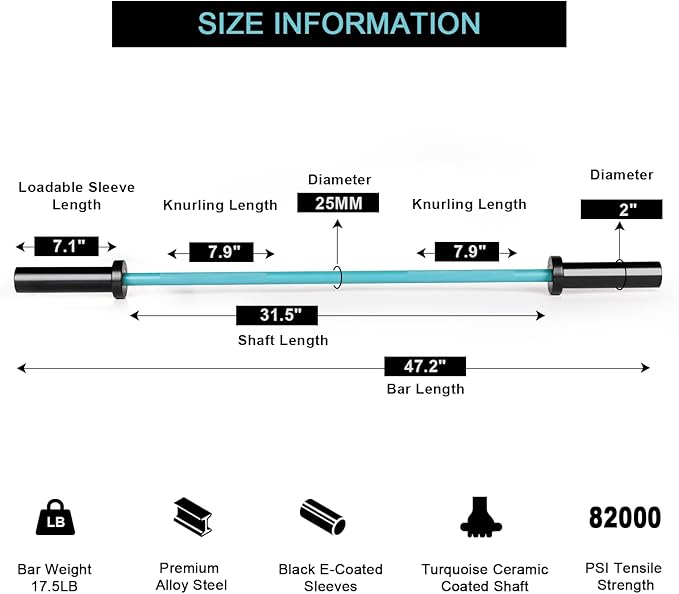 - An Eye-Catching Barbell with Reliable Performance: Crafted from high-grade alloy steel, this 4ft bar is built to withstand the rigors of intense training sessions, ensuring a long-lasting and reliable performance. The sleeves feature a unique black E-coat finish and the shaft is finished with ceramic coating in unique turquoise color, combining corrosion and oxidation resistance with a stylish and elegant appearance.