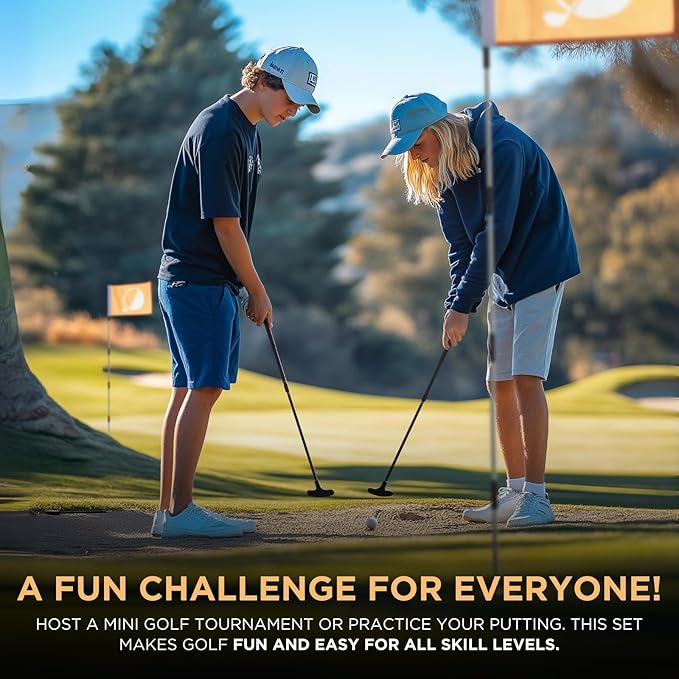 - INCLUDES 2 ADJUSTABLE PUTTERS: Perfect for both adults and kids, fitting different heights for all ages. VERSATILE FOR ALL PLAYERS: Great for beginners and seasoned golfers alike to practice their skills. DURABLE DESIGN: Built to withstand frequent use, ideal for backyard golf fun.