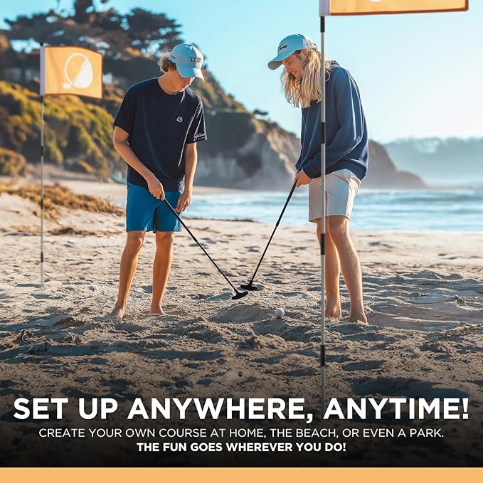 - INTRODUCING THE GOLF & MINIGOLF BACKYARD, PARK, OR BEACH COMPLETE SETUP: The ultimate set for golf lovers to enjoy a full experience at home or on the beach. INCLUDES EVERYTHING YOU NEED: 3 golf pin flags, putting green hole cups, 2 adjustable putters, 6 golf balls, a digger, hole cutter, and more.