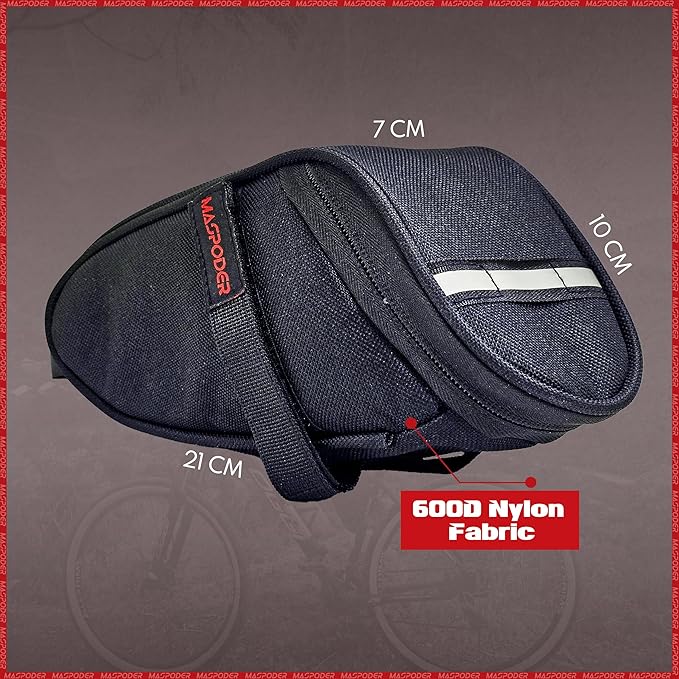 - Well made bike saddle bag. With a capacity of 1.2L, the bike bag easily stores your emergency repair tools and personal items. Made from 600D oxford fabric, this bike bag provides excellent tear resistance and is highly durable, not to mention water resistant in light rain. The bicycle bag also features a reflective design, enhancing safety during night rides. Plus, this bike repair kit comes with a mini tool bag to keep your tools organized and tidy.