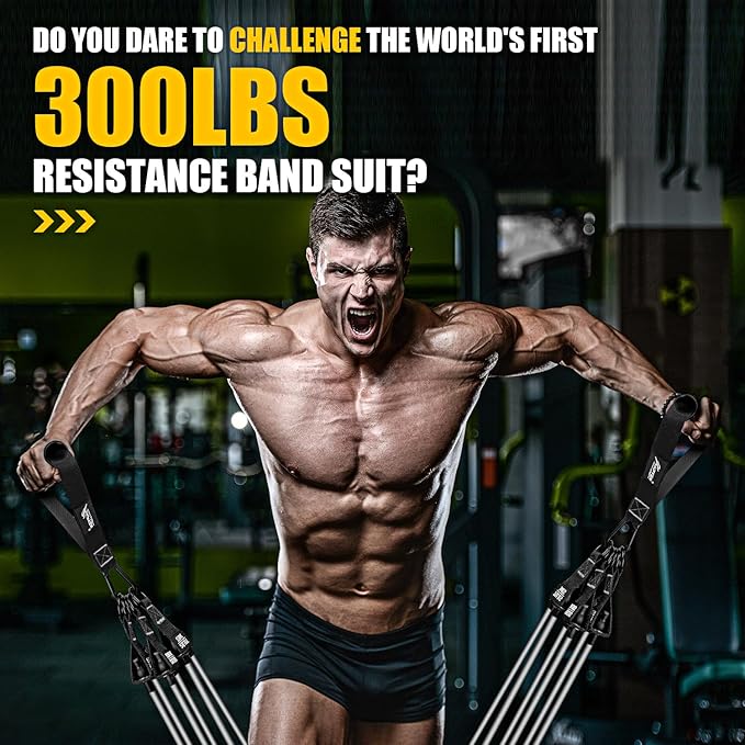 - 【300LBS GREAT TENSION】In order to meet the strength needs of people who love fitness, we have developed the world's first 300lbs resistance band suit, A real man's resistance band suit, it's here, do you dare to challenge it? The fitness bands can reach up to 300 pounds with 6 different resistance levels(25lbs, 35lbs, 45lbs, 55lbs, 65lbs 75lbs), You can freely combine our resistance bands according to your strength!