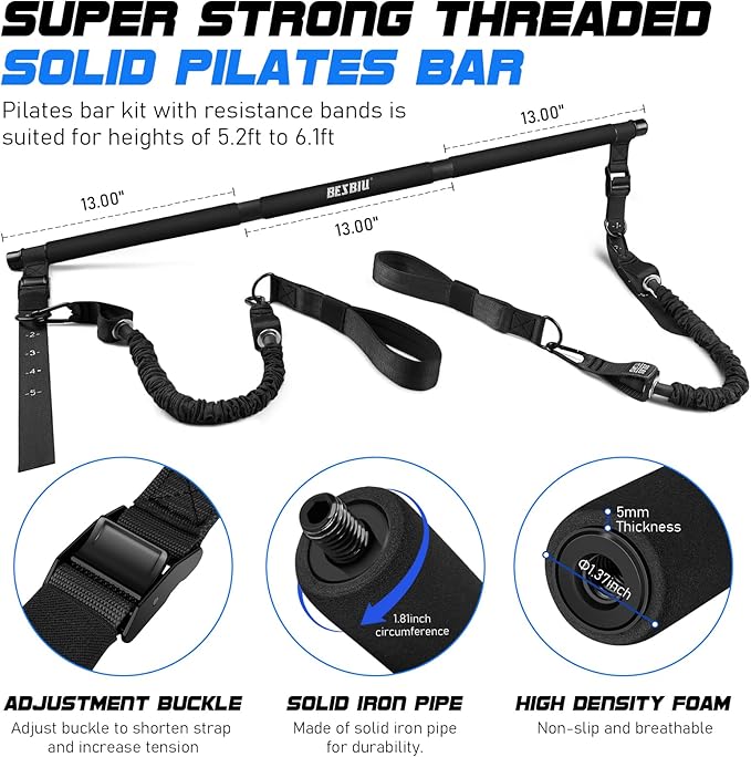 - ADVANCED THREADED PILATES BAR: Composed of 3 sections Φ1.37-inch solid steel rods, with 5mm Soft Nitrile Rubber pad (wear-resistant, sweat-absorbent, non-slip), and can perform stable and safe exercises even if sweat during exercise. Squat bar ends are equipped with adjustable straps with a heavy metal buckle cam that allows you to quickly and easily adjust the length required for various exercises and individual heights. This strong screwed solid squat bar can withstand 600lbs of resistance