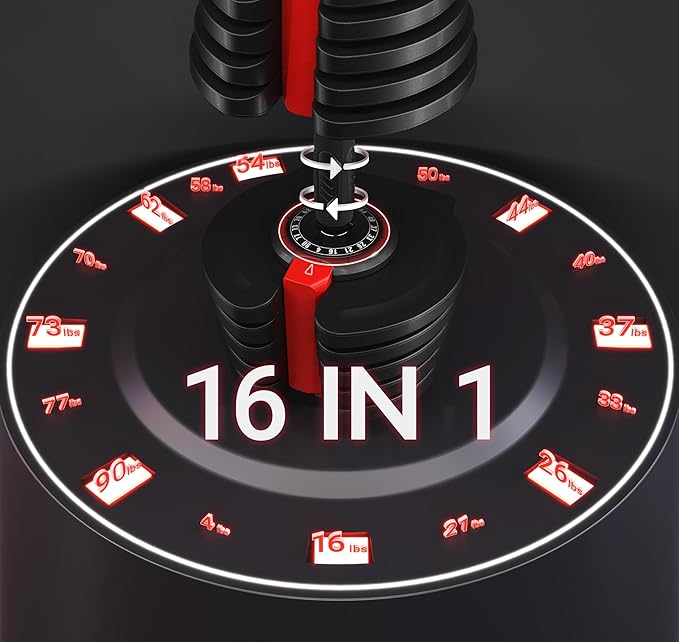 - 16-IN-1 ADJUSTABLE DUMBBELLS:This dumbbell set spans a wide weight range from 4 lb to 90 lb in diverse and smaller increments to facilitate gradual resistance, intensity, or volume adjustments.