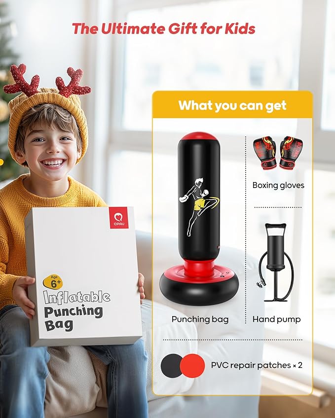 - IDEAL SIZE: The kids punching bag is 66 inches tall after fully inflated. Itβs designed for kids 6+ years old and encourages more enjoyable family time. Its bottom base is 31 inches long in diameter, wider than most punching bags on the market, and that provides more stability with weight. The inflatable punching bag helps children strengthen physical fitness and relieve energy while they are at home.