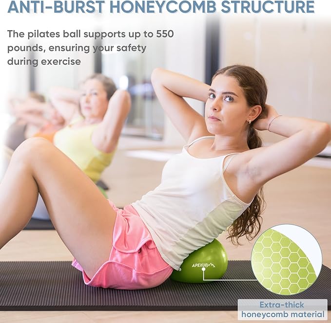 - [ANTI-BURST & ANTI-SLIP] Reinforced with a honeycomb structure for anti-burst protection, this small pilates ball can support up to 550 lbs of weight and will not suddenly burst even when pierced by sharp objects. The fine texture provides non-slip properties, ensuring a safe exercise experience.