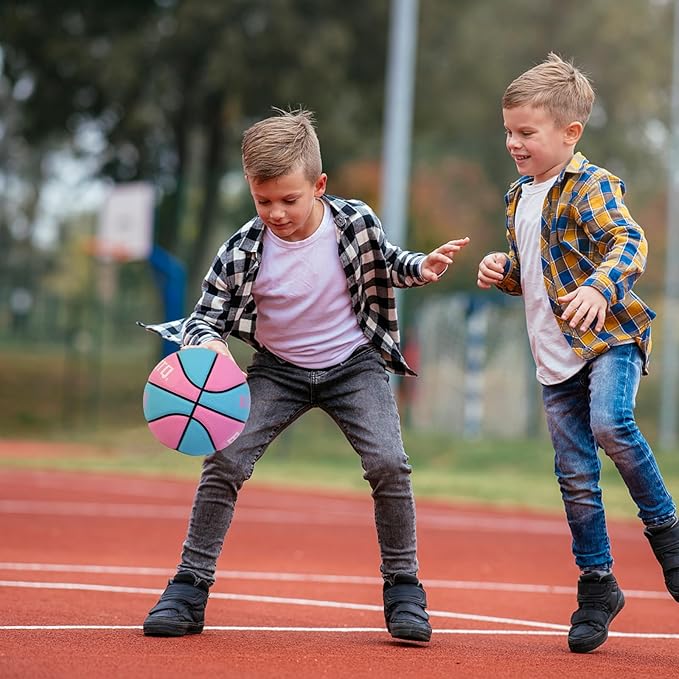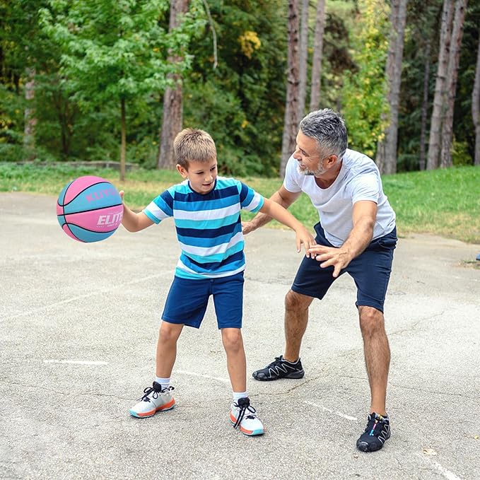 - 【CARRYING HAPPINESS】Our Thickened Rubber basketball designed with classic Pink + Blue color, which is eye-catching to kids, also the ELITE logo is universal and classic. Perfect choice for sending to boys and girls as as a gift on birthday, Christmas Day and other festive occasion.
