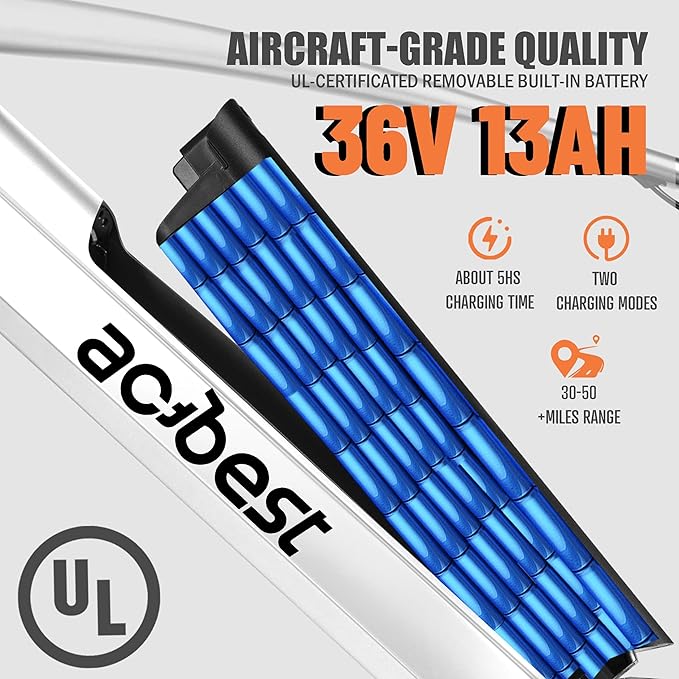 - 36V 13AH Removable Built-in Battery - The UL2849-certificated battery is easy to remove for charging and has a waterproof, shockproof and anti-theft design, which is safer and lasts much longer. The battery only takes 4-6 hours to fully charge, giving you a range of up to 35 miles (throttle)/50 miles (PAS) on a single charge.