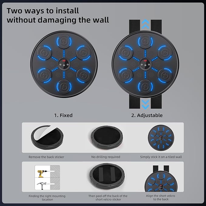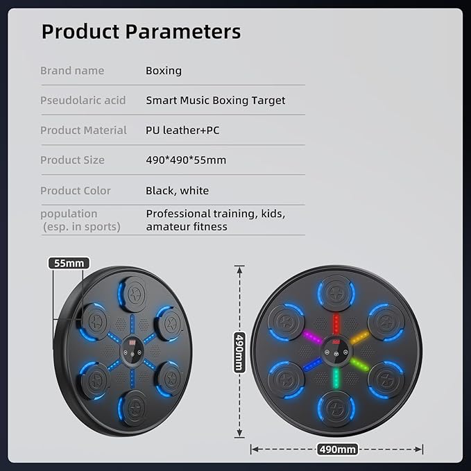 - 【RGB Cool Lights & LED Display & Bluetooth】This smart music boxing machine is equipped with upgraded speakers. When you hit the lit target, the device will emit music and light effects, and the LED display will show your hit count to stimulate your interest in exercise. The smart boxing music machine supports Bluetooth pairing, and you can choose your favorite songs during boxing training. Surround speakers and cool lights bring you the best audio-visual effects and the best exercise experience.