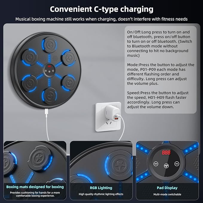 - 【9 Modes and 9 Speed Changes】The music boxing machine has 9 modes and 9 speeds, which is a perfect choice for professionals and beginners. It can intelligently identify music and enhance the visual experience through LED light effects, providing an immersive experience. The boxing machine can improve your reaction speed and body coordination, achieve comprehensive muscle training and get entertainment enjoyment.