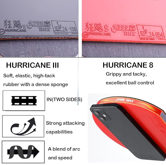 - High-Elasticity Rubbers for Speed & Spin:Equipped with Hurricane 8 high-tack rubber, this Table Tennis Paddle provides excellent elasticity and speed, making it ideal for powerful attacks. Paired with Hurricane 3, which offers durable tackiness and outstanding spin, it excels in fast attacks combined with looping rallies