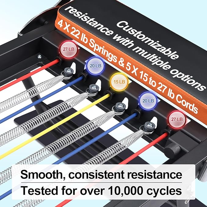 - 🌟【Customizable Adjustments】: Our Pilates machine features 4 springs with 22 lb resistance and 5 cords ranging from 15 to 27 lb, offering five levels of exercise resistance. Additionally, the foot bar has four adjustable angles, and the silent pulley system provides three adjustable heights. Easily tailor your Pilates reformer to fit your workout needs.