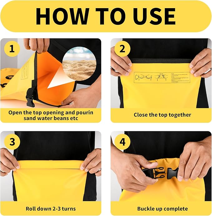 - Easy to Use: Installation is a breeze fill with rocks or sand, grab the top braid, roll down tightly 3 to 5 times, and buckle to seal; When not in use, it folds into a small size for easy storage and portability