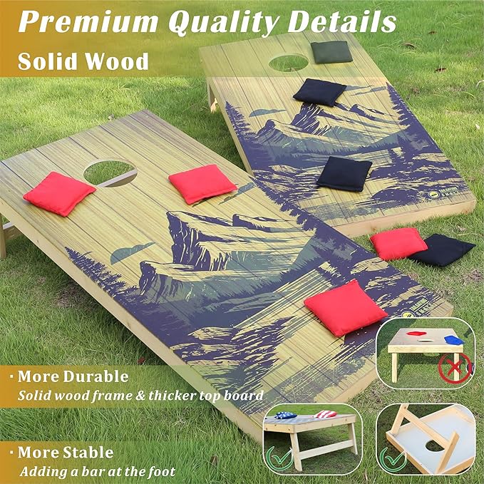 - 【Premium Solid Wood Construction】Our 4'x2' wooden cornhole board set are made of high quality poplar wood for the top board by 12mm and solid pine wood for the frame, with adding a bar at the foot, our wood cornhole boards are more stable and durable than other thin engineering boards in the market.