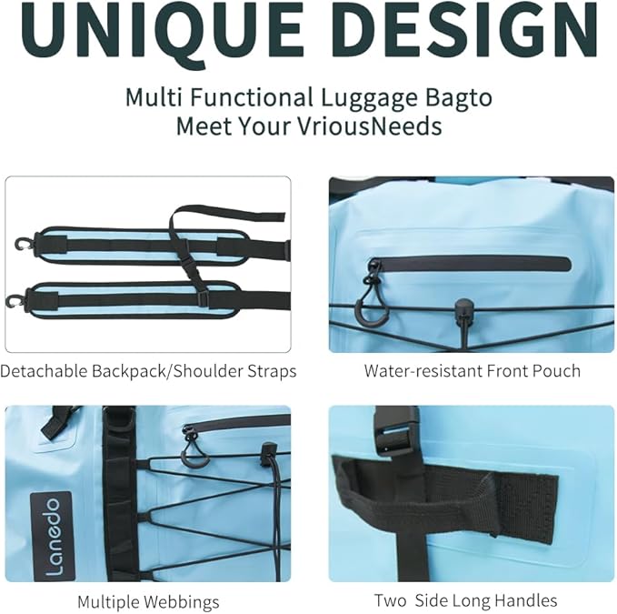 • MULTIPLE APPLICATION-- LANEDO marine dry bag 80L is suitable for water sports like kayaking and paddle boarding, it is not only as waterproof duffle bags for boating, but also fishing, diving, motorcycle trips, hiking, and other outdoor activities