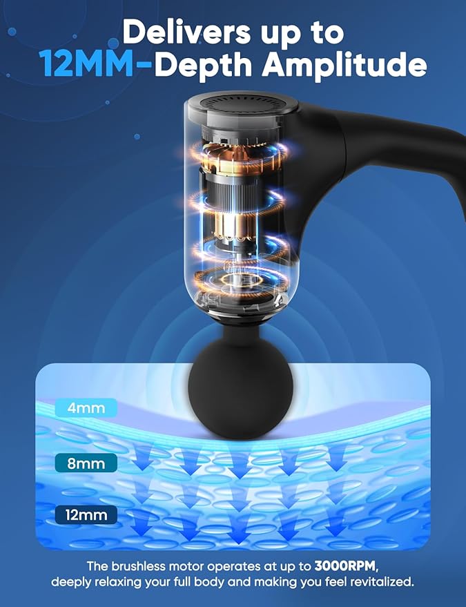 - Deep-Tissue Massage & Smooth Speed Adjustment:Powered by a high-performance brushless motor, our percussion massage gun operates at up to 3,000 revolutions per minute. With a robust drive system, it effortlessly revitalizes muscles and provides deep tissue massage, penetrating up to 12mm for effective pain relief