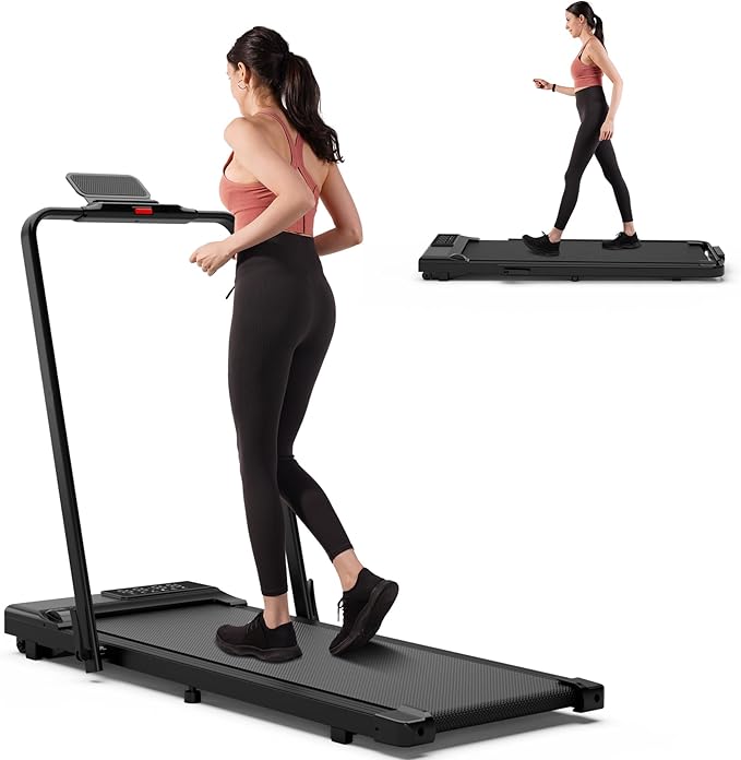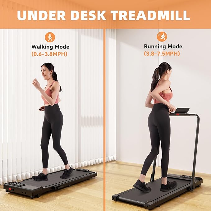 - 3 IN 1 FOLDING TREADMILL: The upgraded foldable treadmill offers three modes: Walking Pad / Under Desk Mode with a speed range of 0.6-3.8mph when the riser is folded, and Running Mode with a speed range of 0.6-7.5mph when the riser is raised. It provides flexibility to meet different exercise needs. You can adjust the speed using either the remote control or the touch keyboard