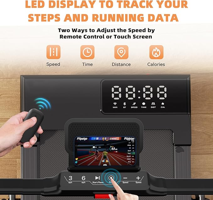 - SMART APP & LED DISPLAY: The mini treadmill features a smart APP for recording exercise data and offers virtual simulations, multiplayer connectivity, team races and rewards, enhancing workouts with interactive features and friendly competition. Even without using the APP, the small treadmill's LED display can track real-time exercise metrics such as time, speed, distance, and calories burned