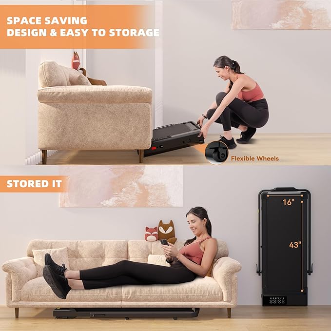 - NO ASSEMBLY & SPACE SAVING: The portable treadmill requires no installation and can be used straight out of the box. It is designed to be sturdy and slim, with a compact size that makes it ideal for small spaces. The wheels design allows for easy movement to any desired position in your home or office