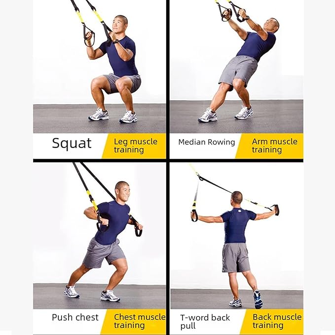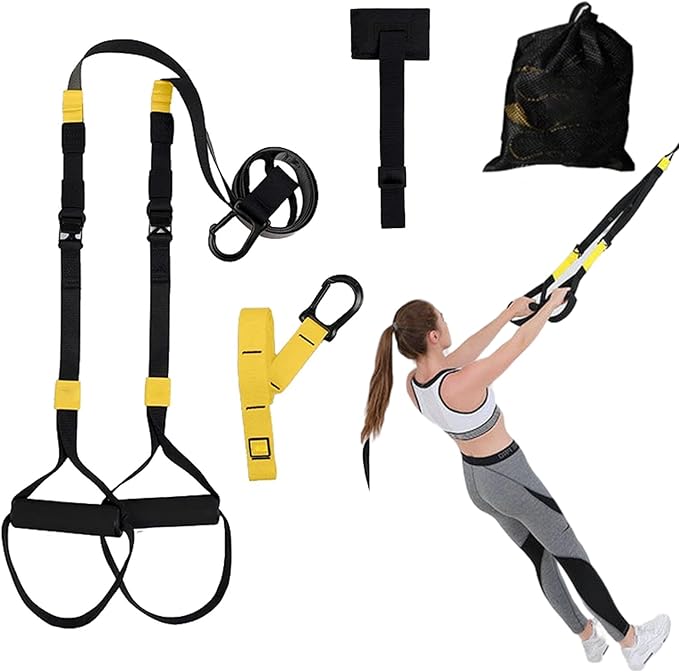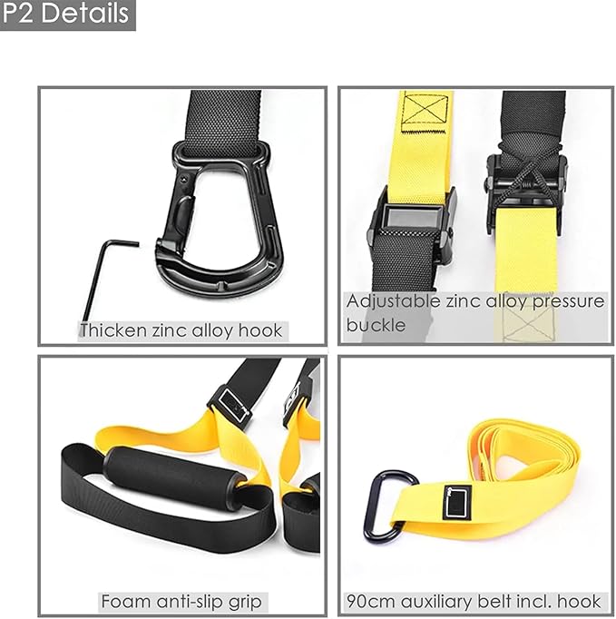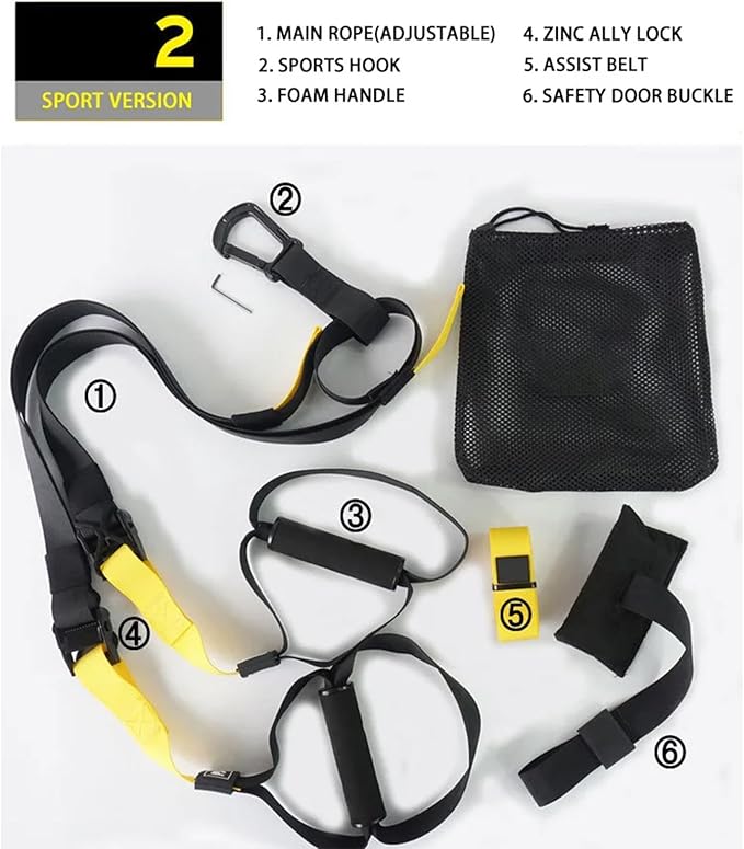 - What You Get: 1 set of suspension training straps, composed of: 1x Main Rope( Adjustable), 1x Sports Hook, 1x Foam Handle, 1x Zinc Ally lock, 1x Assist Belt, 1x Safety Door Buckle, 1x Mesh bag, Allowing you to choose your own way to set up and do various exercises anytime, anywhere.