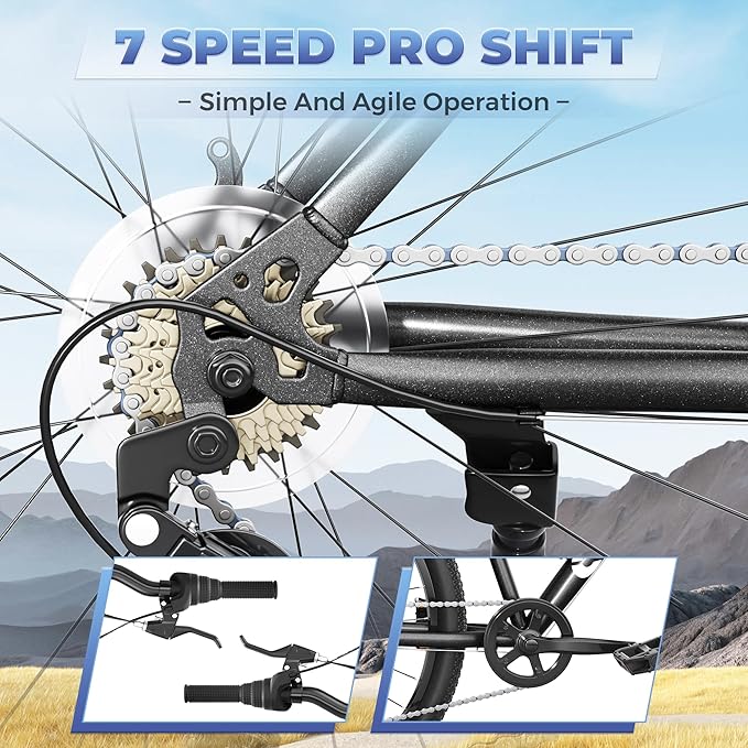 - 🚲Unmatched Drivetrain: Seamlessly switch between7 speeds for an unparalleled roading experience.