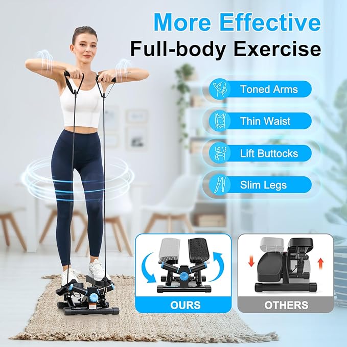 - Full-Body Fat Burning & Shaping: Experience enhanced fat burning and muscle strengthening with our mini stepper. Its twist motion engages multiple muscle groups, providing a full-body workout that targets legs, arms, shoulders, and core. Whether you're starting your fitness journey or aiming to diversify your routine, our mini stepper with resistance bands is your ideal companion for achieving your fitness goals.