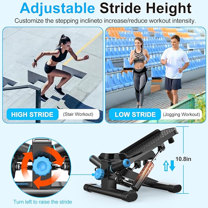 - Flexible Height Adjustment: Our mini stair stepper features an adjustable knob that allows you to customize the stride height from 20.5cm to 27.5cm, catering to your individual needs. A lower stride height facilitates easier stepping, while a higher setting best simulates stair-climbing, offering nearly double the workout effectiveness compared to non-adjustable steppers.