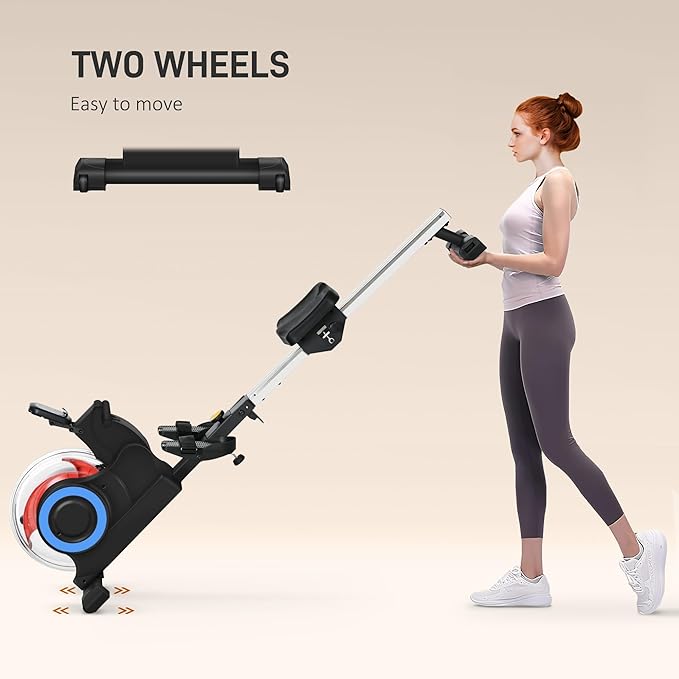 - Foldable Rowing Machine: This rowing machine is portable and easy to store. Fold it in half to take up half the space. With two wheels on the bottom, our folding rowing machine can easily move to any area around your home.