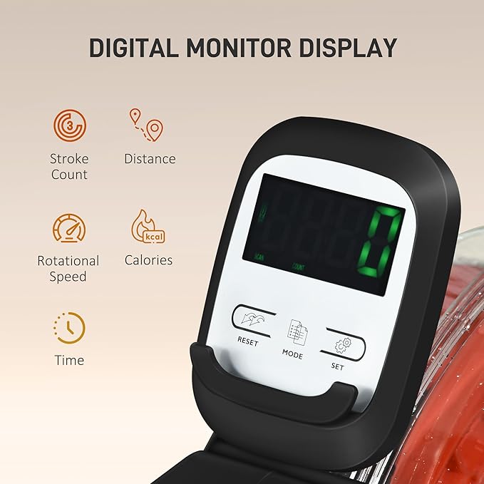 - Knowledge is Strength: Our water rower offers an LCD screen to count reps, calories burned, distance, speed, and time elapsed. Record your progress and optimize your workout for greater gains.