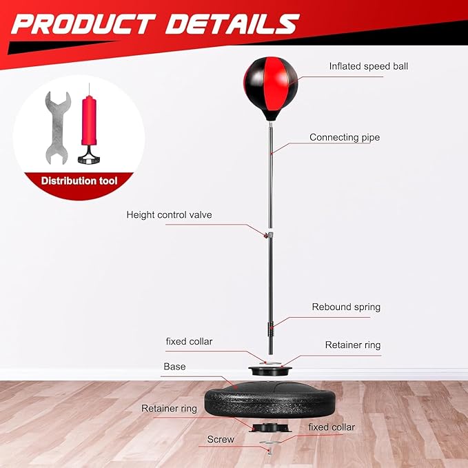- 【Height Adjustable Stand】: With high-strength steel pipes and a rotating regulating valve design, the boxing ball can be freely adjusted in height according to the child's height. The spring adopts high-strength and resilient spring, with fast rebound speed, which trains the baby's quick reaction ability