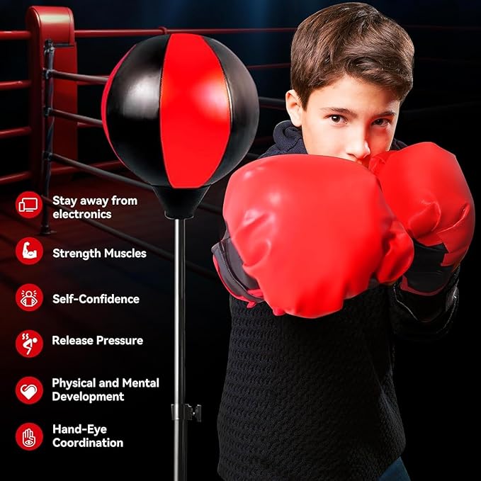 - 【Punching Bag for Kids】:Punching bag is a great fitness exercise toy for kids, which can promote their physical and mental development. Punching bag not only keeps children away from electronic screens, builds up their bodies, boosts confidence, releases stress, but also is ideal for family interaction and daily entertainment, and enhance parent-child relationships