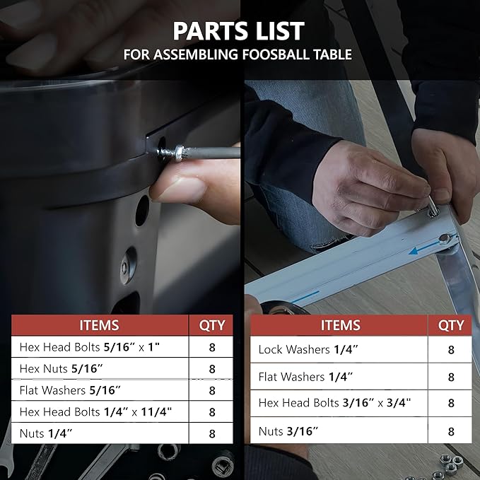 - EASY INSTALLATION: This foosball air hockey combo table comes with a pre-assembled playfield; just attach the legs for a fast and effortless setup. This soccer table game includes step-by-step instructions, a video guide, and all necessary tools for a smooth, hassle-free experience. Set up your game room and start playing in no time.
