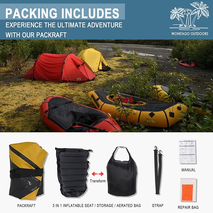 - MUST HAVE FOR OUTDOOR ENTHUSIASTS ---Choose WONITAO, enjoy a happy journey of water sports with your family, whether you're exploring the coast, racing down a river, or enjoying a peaceful lake, our packrafts are the perfect choice for your next adventure