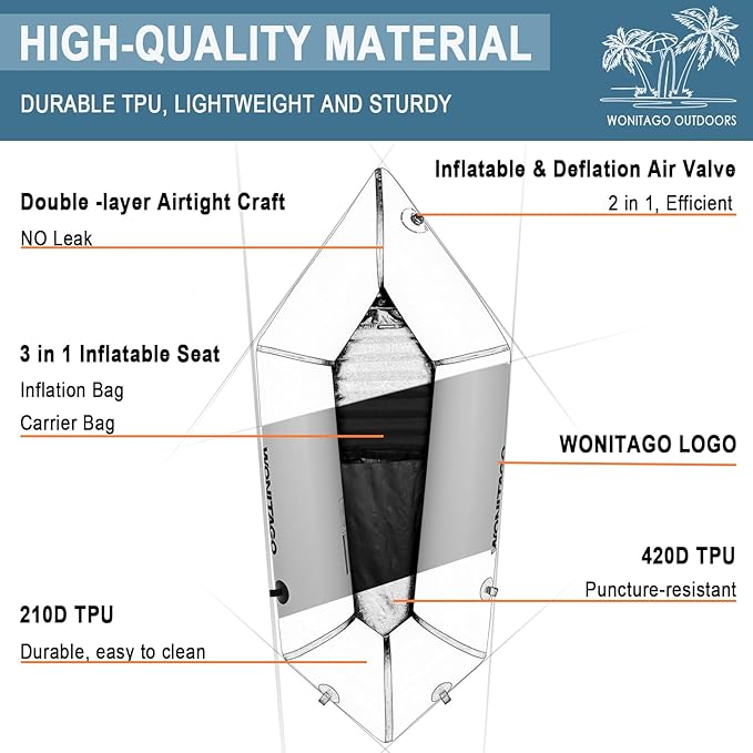 - MUST HAVE FOR OUTDOOR ENTHUSIASTS ---Choose WONITAO, enjoy a happy journey of water sports with your family, whether you're exploring the coast, racing down a river, or enjoying a peaceful lake, our packrafts are the perfect choice for your next adventure