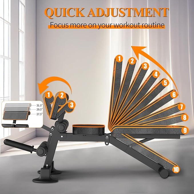 - 💪【ADJUSTMENT & FUNCTION】: Workout bench has 10 backrest pad positions and 3 preacher pad degrees to meet your home gym demand. Adjustable weight bench is ideal for full-size adult working out and training on your chest,shoulder,back,abs,leg and more.