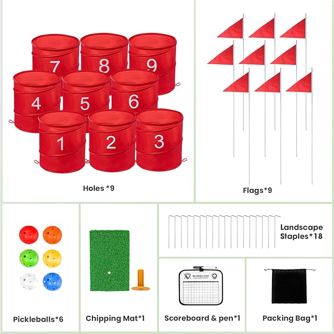 - Outdoor Fun Complete Set: Includes 9 buckets, 9 flags, 1 hitting mat, 6 balls, 18 ground stakes, a dry-erase scorecard, and a convenient carrying and storage bag - everything you need for a full game. Enjoy the fun anytime, anywhere with this bucket golf set