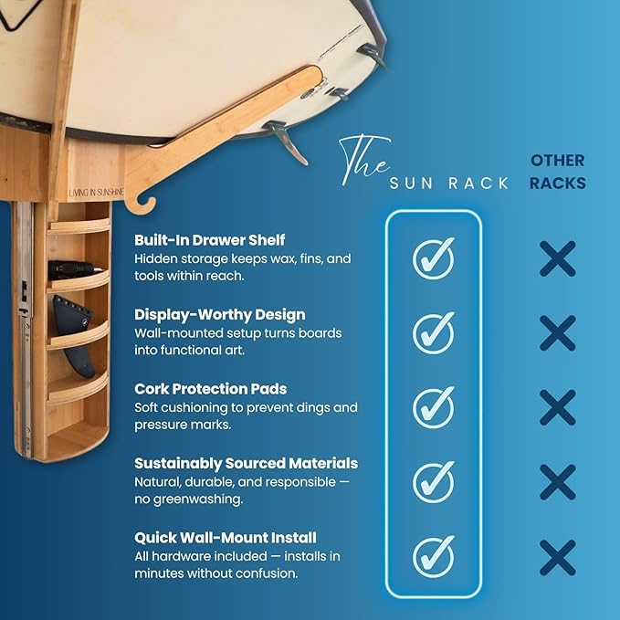 LISS The Sun Rack - Premium Wood Surfboard Wall Mount Rack Display, Ski, Snowboard Holder for 4 Boards for Garage & Home Storage with Built-In Drawer & Hooks for Longboards Shortboards, Wakeboards