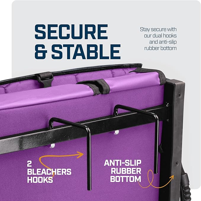 - STURDY & SECURE – Built with anti-slip rubber and 2 retractable bleacher hooks, this cushion provides firm stability on any surface, preventing slipping or sliding on bleachers, benches, backs, or other hard seating. Perfect for securing your spot at any stadium or outdoor event.