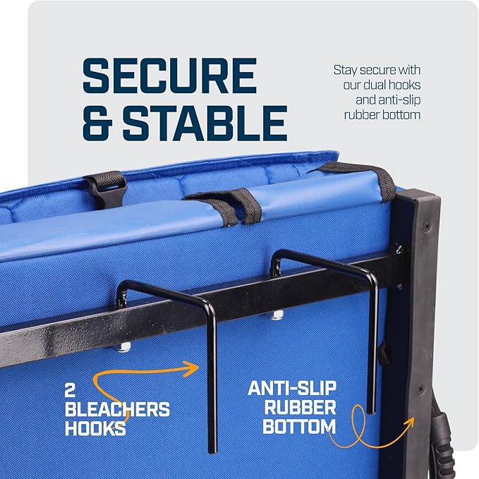 - STURDY & SECURE – Built with anti-slip rubber and 2 retractable bleacher hooks, this cushion provides firm stability on any surface, preventing slipping or sliding on bleachers, benches, backs, or other hard seating. Perfect for securing your spot at any stadium or outdoor event.