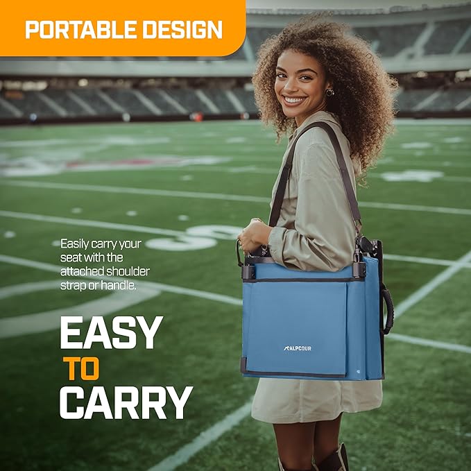 - PORTABLE & EASY TO CARRY – Weighing under 10 pounds, the bleacher seats with backs and cushion is equipped with a convenient carry handle and shoulder straps, making it easy to transport despite its sturdiness. Perfect bleacher seat for picnics, or any outdoor adventures.