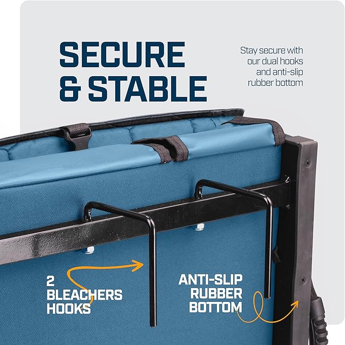 - STURDY & SECURE – Built with anti-slip rubber and 2 retractable bleacher hooks, this cushion provides firm stability on any surface, preventing slipping or sliding on bleachers, benches, backs, or other hard seating. Perfect for securing your spot at any stadium or outdoor event.