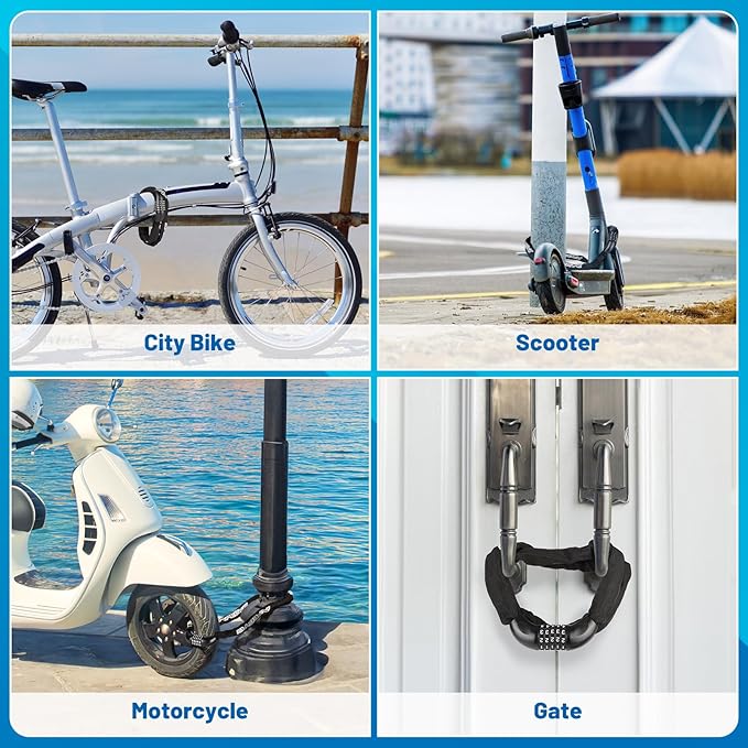- Versatile: compact and portable lock is equipped with thick and durable protective cover preventing your bicycle from scratches and allow easy transport on the bike when not in use. The bicycle lock is perfect for you looking to secure your bicycle, scooter, motorcycle, e-bike, golf cart, lawnmower, generator, gate, fence, grill etc