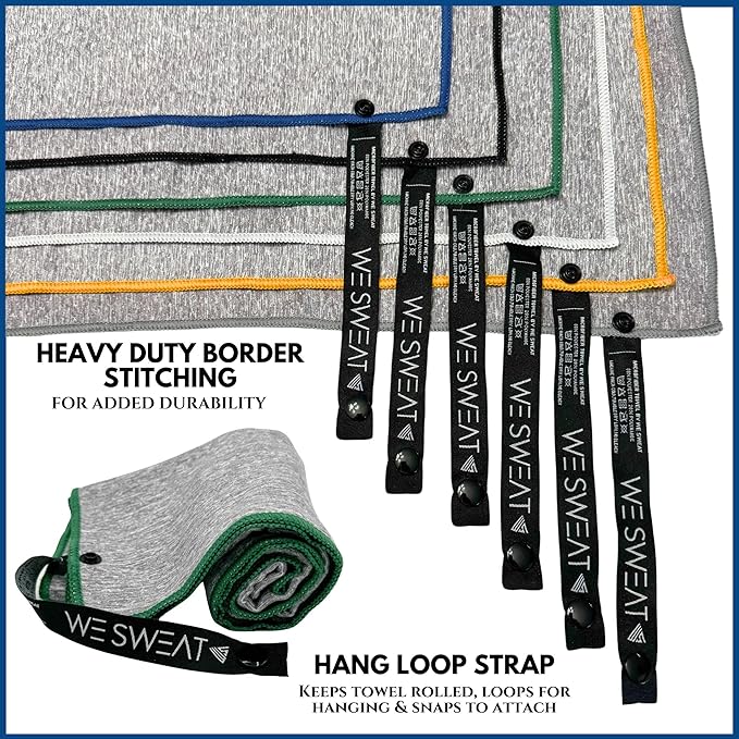 - Hang Loop Snap Strap – WE SWEAT’s microfiber towels are perfect for any activity, with the added convenience of a strap that snaps. The snap strap closure allows you to have your towel attach to a workout machine, your arm, backpack, or even your belt loop. WE SWEAT’s microfiber towel for body are convienant when exercising whether hanging, or having it snapped and rolled up into a packable travel-friendly size.
