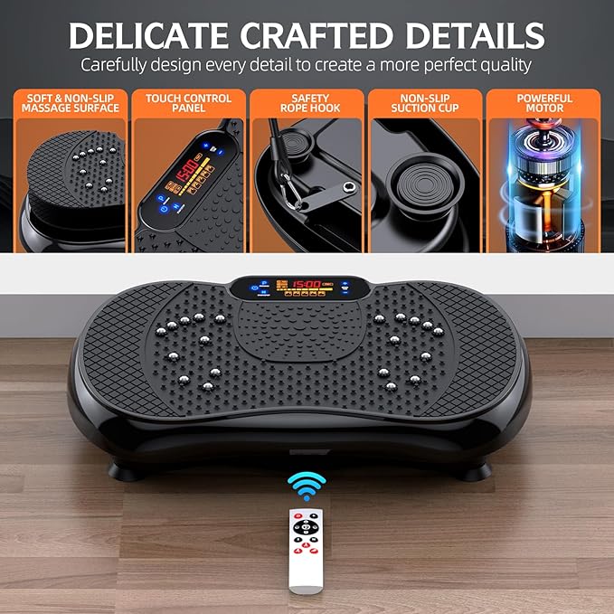- 【SUPERIOR QUALITY& SAFETY DESIGN】It supports a maximum load capacity of about 330 lbs. Anti-slip surface design & impact-resistant ABS housing ensures the durability and safeguarding of the motor. Four non-slip suction cups on the bottom ensure stability of the vibration plate, prevent slipping. Exercise with less noise and minimal distractions.