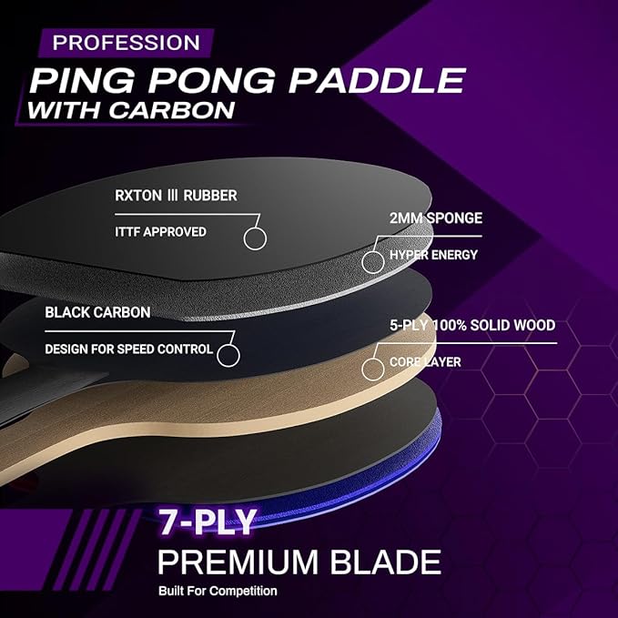 - MADE FOR COMPETITION: This high-performance 7-layer blade table tennis racket is constructed of 5 layers of premium wood and 2 layers of carbon fiber with 2.0mm professional racing sports sponge and ITTF-approved super viscose rubber, providing you with maximum spin and excellent control during games.