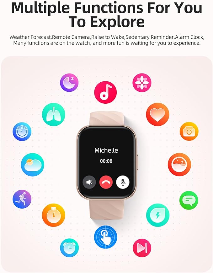- 【DISCOVER MORE EXCITING FEATURES】This smart activity tracking watch not only records your daily movements but also offers a range of practical features: all-day activity tracking, breathing exercises, female health monitoring, weather updates, music control, stopwatch, alarm, timer, camera control, brightness adjustment, sedentary reminders, phone finder, wrist-raise wake-up, and more. It’s your personal health and lifestyle assistant, always by your side, helping you manage your life and wellness, keeping you energized and active every single day!