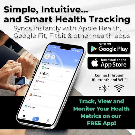 - Smart Connectivity & Health Tracking: This advanced smart scale features Bluetooth and Wi-Fi capabilities, transforming your health tracking experience. Instantly upload your data to the cloud and easily sync with both iOS and Android devices, ensuring you have access to your health data anytime, anywhere. The scale integrates seamlessly with popular health apps like Apple Health, Google Fit, and Fitbit. Whether at home, at the gym, or on the go, tracking your progress is effortless—empowering you to take charge of your wellness journey.