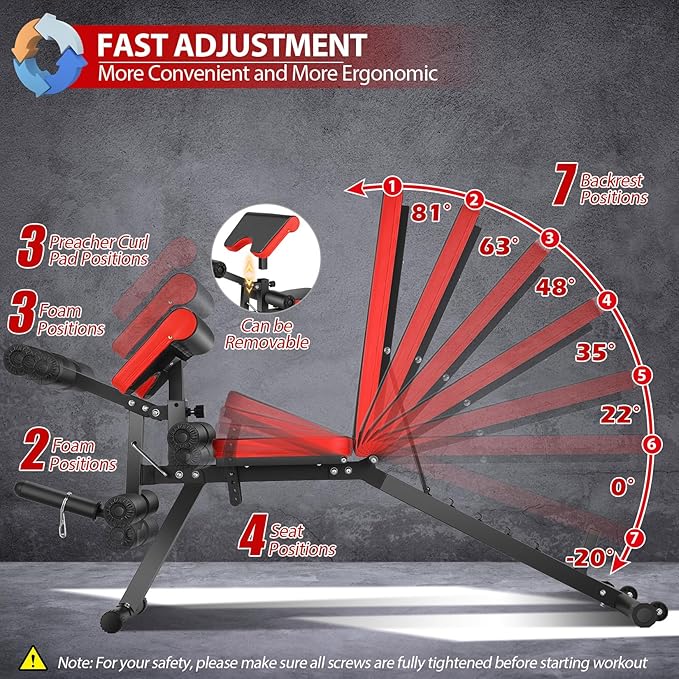 - 【Multi-Functional Training】This weight bench is suitable for exercises such as preacher curls, single-arm rows, dumbbell bench presses, leg extensions, and leg curls, helping you achieve comprehensive fitness results.