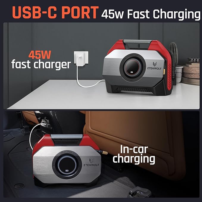 - BUILT-IN 19200 mAh LITHIUM BATTERY: Vortex S6 can inflate 18 F150 tires (245 70/R17 31”) from 30 to 35 PSI on full charge. Along with USB-C 45W dual-direction fast charging port, capable of both rapid charging and powering electronic devices