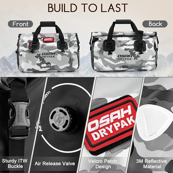 - WATERTIGHT PROTECTION: OSAH DRYPAK duffel bag is made of durable high-strength PVC, which is completely waterproof & snowproof. Ideal weekender bag for all your sailing, fishing, camping, sporting, boating, and motorcycling travel adventures.