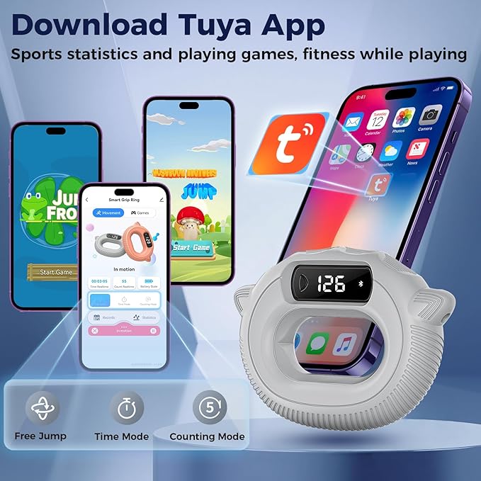 - Intelligent App without Ads- Gorifei gripsner can be connected to the mobile app via Bluetooth for use. The app, named tuya, is accessible on both iOS and Android systems. Once connected, you can pick from 3 training modes available in the app. 1. Free Jump: Train freely without any time or grip frequency restrictions. 2. Time Mode: Set a defined period for your hand grip training. 3. Counting Mode: Determine a goal the number of grips you aim to achieve. When you begin your training, the grip count shown on the Gripsner screen will be automatically synced to the app.